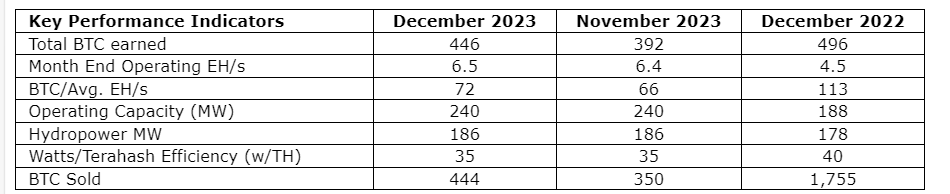 6.5 exahashes/second on-line as of Dec. 31, 2023, up 44 per cent from Dec. 31, 2022, and up 2 per cent from Nov. 30, 2023;