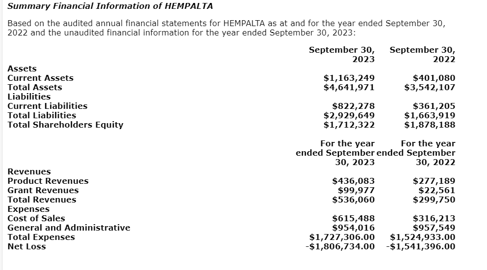 Hempalta has 47,176,627 common shares issued and outstanding, 2,629,964 common share purchase warrants issued and outstanding, and 4.7 million incentive stock options to purchase common shares issued and outstanding. Additionally, Hempalta has an aggregate of $565,000 in convertible debentures presently outstanding which are expected to convert into 3,531,250 Hempalta shares automatically in connection with the closing of the transaction.