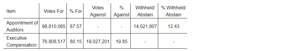 In addition, KPMG LLP was appointed as auditor of the company, an advisory vote approved the approach to executive compensation, and an amendment to the company's quorum requirements was approved. Details of each of these resolutions are included in the company's management proxy circular.