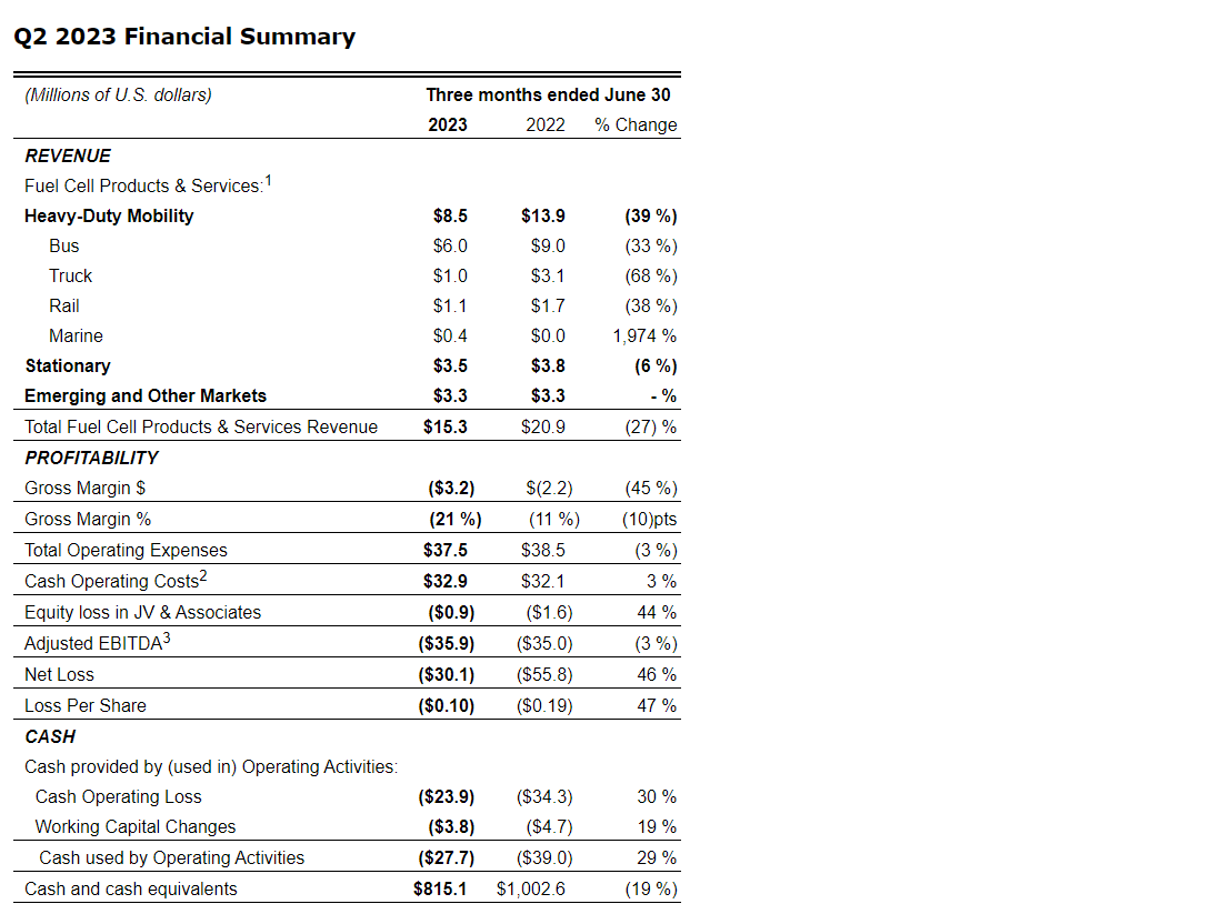 Ballard Power Systems Inc. has released consolidated financial results for the second quarter ended June 30, 2023. All amounts are in United States dollars, unless otherwise noted, and have been prepared in accordance with international financial reporting standards (IFRS).