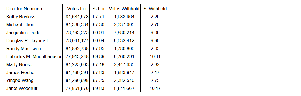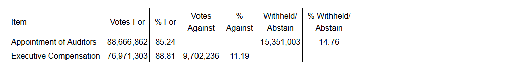 In addition, KPMG LLP was reappointed as auditor of the company, and an advisory vote approved the approach to executive compensation. Details of each of these resolutions are included in the company's management proxy circular.