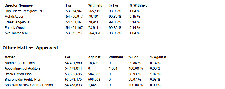 Approximately 2.7 million shares (representing 2 per cent of the issued and outstanding shares) were scheduled to be voted at the AGM in favour of the board however, were deemed ineligible due to not meeting the cut-off requirements.