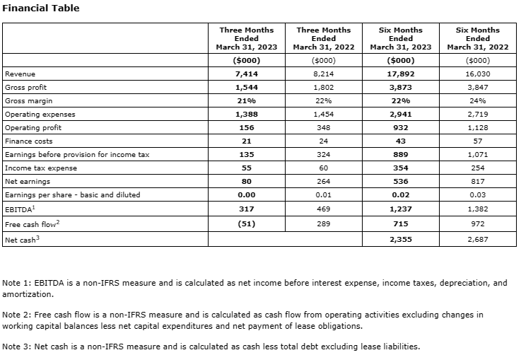 • Revenue for the three and six months ended March 31, 2023, was $7.4 million and $17.9 million respectively, compared to $8.2 million and $16.0 million in 2022.