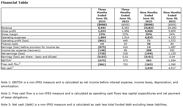 - Net loss for the quarter ended June 30, 2023, was $0.7 million, compared to net earnings of $0.3 million in the same quarter of the previous year. Year-to-date net loss for fiscal 2023 was $0.2 million, compared to net earnings of $1.1 million year-to-date for fiscal 2022.