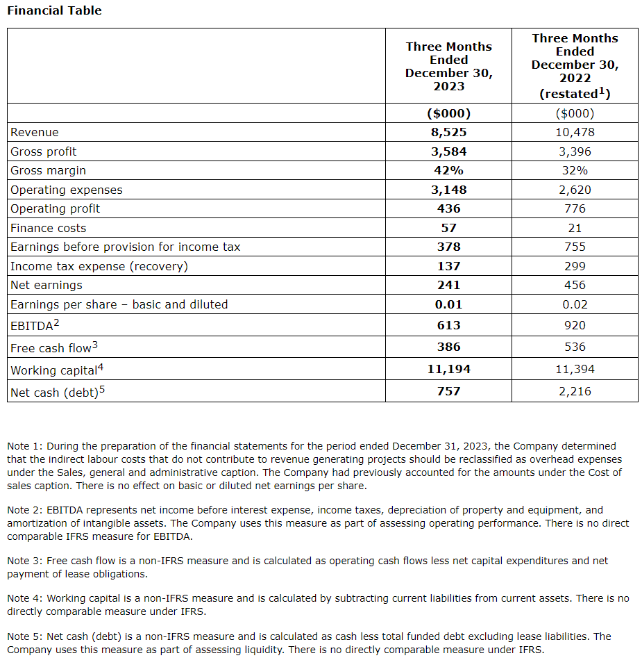 - Net cash as at Dec. 31, 2023, was $800,000, compared with net cash of $2.9-million at Dec. 31, 2022. The company expects an increase in its net cash as it is awaiting a large payment from a government client whose fiscal year-end is March 31.