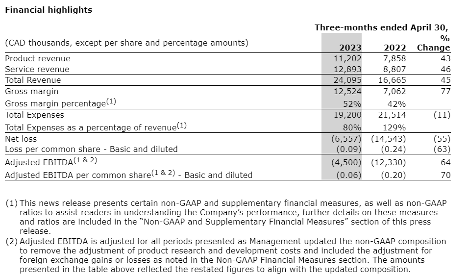 "On the margin front, we experienced the strongest service margins in company history of 75 per cent. Our product margins also improved significantly year-over-year from 13 per cent to 26 per cent and increased sequentially from 21 per cent in Q1 2023. Looking forward, we anticipate continued margin improvements through the remainder of the fiscal year through our enhanced pricing strategy, increased manufacturing automation and continued cost optimization.