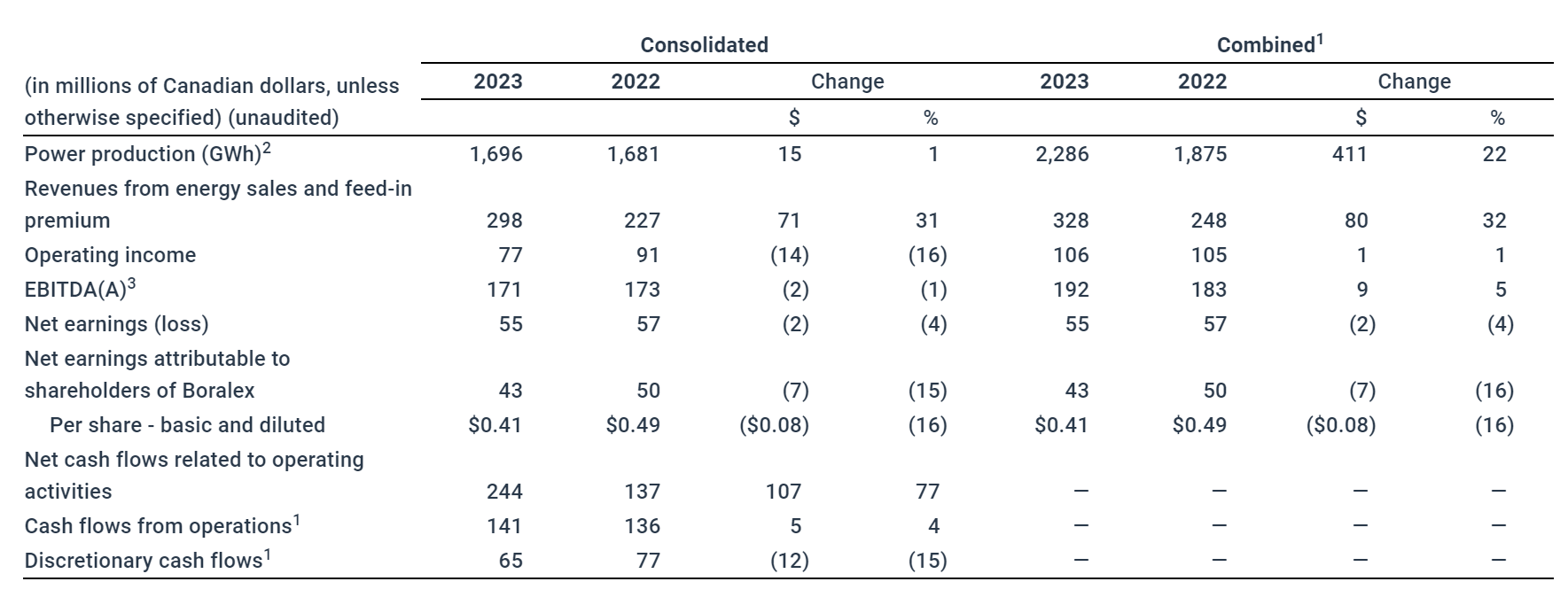 For the three-month period ended March 31, 2023, revenues from energy sales and feed-in premiums totalled $298 million ($328 million), 31 per cent (32 per cent) more than in the first quarter of 2022. The increase is attributable to the contribution of the US acquisition and commissioning of assets, as well as to the higher production and high electricity prices in France. EBITDA(A)3 amounted to $171 million ($192 million), 1 per cent less (5 per cent more) than in the first quarter of 2022. The slight decrease in EBITDA(A) is attributable to lower production from Canadian wind farms and new regulations on certain contracts in France. It should be noted that in the first quarter of 2022, EBITDA(A) included an amount of $16 million attributable to certain contracts for which Boralex had to record a provision in the third quarter of 2022 following the publication of the 2022 Supplementary Budget Act in France. The increase seen on a combined basis is attributable to the wind farms acquisition in the United States. Operating income amounted to $77 million ($106 million), which compares to $91 million ($105 million) for the same quarter of 2022.