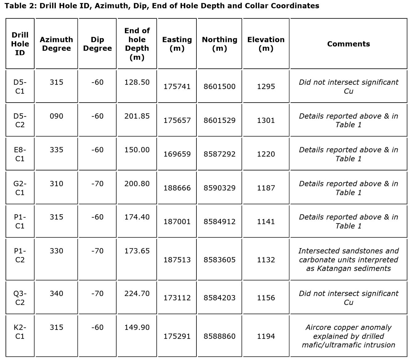 Drill hole P1-C1 intersected several zones of copper mineralization including 0.50 metres grading 0.37% Cu from 131.46 metres and 0.78 metres grading 0.48% Cu from 148.80 metres drilled depth. This copper mineralization appears to be hosted in basement units. Drill hole P1-C2 some 1,400 metres to the southeast of P1-C1 intersected a package of carbonate and sandstone units interpreted to be the Katangan sediments. Several aircore lines are planned to the eastern strike extension of this area within the P-Target.