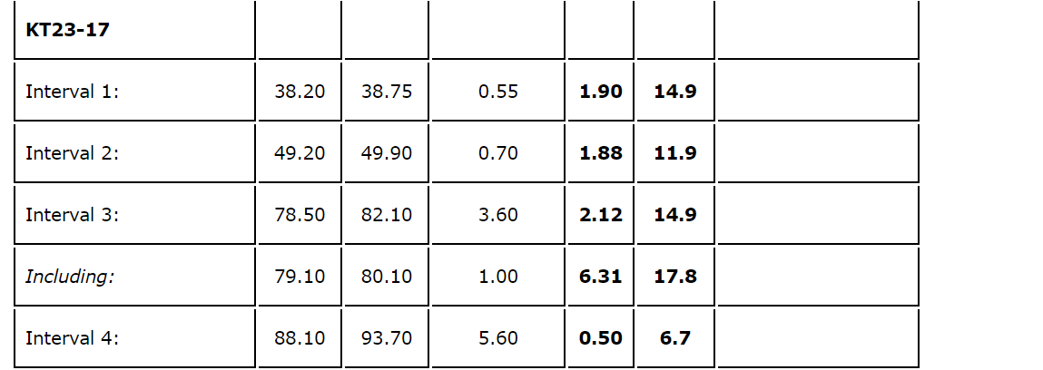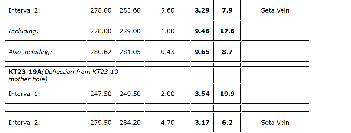 Assay results from quartz veins in KT23-18 returned an intersection of 10.54 metres grading 1.28 g/t Au and 17.4 g/t Ag, including 1.37 metres grading 4.48 g/t Au and 75.5 g/t Ag from 88.26 metres down-hole depth. This intersection does not correlate with either the Seta or Kamitake veins, but appears to be a new, relatively shallow zone of mineralization. An additional zone of mineralization in this hole of 6.70 metres grading 2.48 g/t Au and 36.1 g/t Ag from 229.60 metres, including 1.90 metres grading 7.50 g/t Au and 91.7 g/t Ag, is currently interpreted to lie between the Kamitake and Seta veins. KT23-18, however, did not reach the Seta vein target.