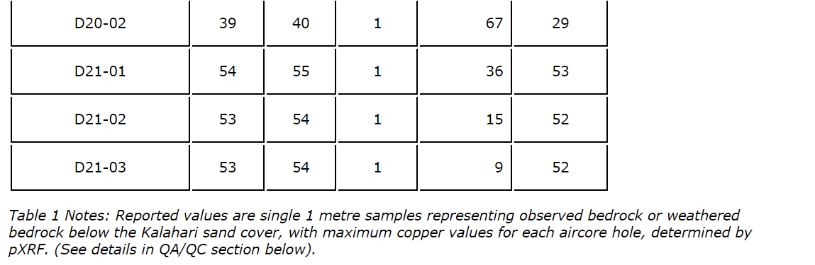 - Target zone 1 -- identified by four air core holes with copper values of: 5,870 ppm Cu (D14-03), 5,079 ppm Cu (D15-02), 2,942 ppm Cu (D16-03B) and 4,363 ppm Cu (D7-04). The footprint of this zone at the base of the Kalahari cover is approximately 400 metres in length and 100 metres to 125 metres in width and remains open to the north and south.