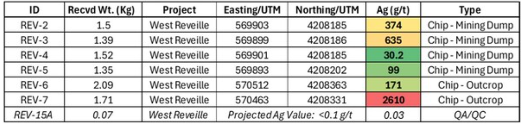 Exploration work has revealed and confirmed high-grade silver occurrences, accompanied by high lead, zinc and copper concentrations, as well as elevated pathfinder elements (arsenic up to 1,360 parts per million and antimony up to 3,110 ppm) and Table 1.