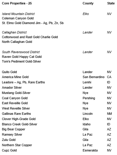 For reference purposes only, the company's current core properties include the following exploration projects. Inclusion in this list does not imply development status, economic viability or future advancement beyond the company's stated exploration strategy.