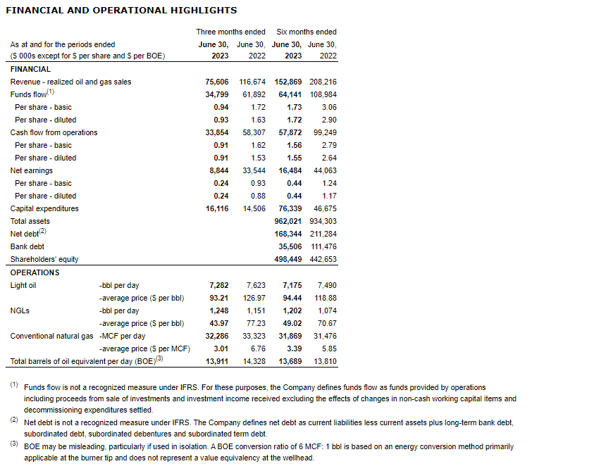 As anticipated, net debt declined quarter over quarter to $168.3-million at June 30, 2023, compared with $183.7-million at March 31, 2023, a function of lower capital spending and field activity combined with higher production volumes, offset by lower realized prices per BOE. These higher volumes in the quarter also contributed to lower operating costs of $16.88 per BOE compared with $17.54 per BOE in the previous quarter.