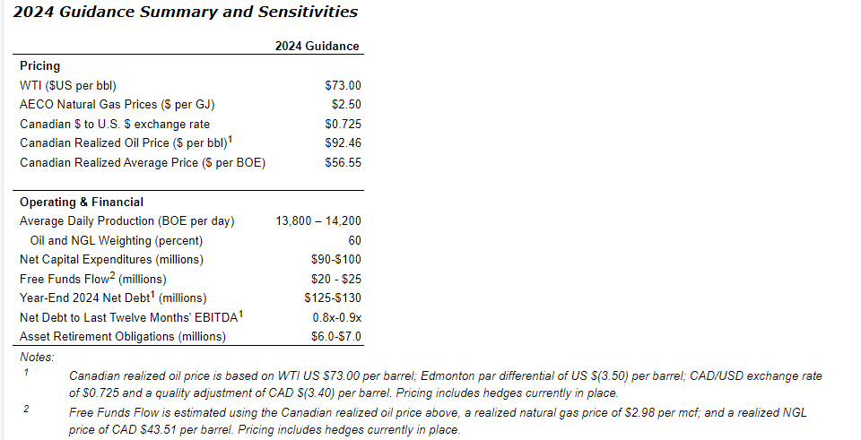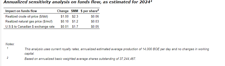 The company's 2024 budget is structured to generate meaningful free funds flow, which can be allocated to further strengthening the balance sheet and modest production growth. While the company remains committed to establishing a sustainable return of capital model, timing for implementation is largely dependent on a favourable commodity price environment. Given recent market volatility and softening in both crude oil and natural gas prices, Bonterra intends to prudently focus on optimizing free funds flow and strengthening the balance sheet.