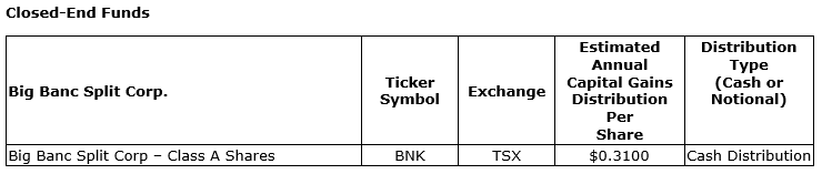 Purpose expects to announce the final 2023 annual capital gain distributions for Big Banc Split Corp. on or about Jan. 23, 2024, if necessary. No capital gain distribution on Big Banc Split preferred shares (Toronto Stock Exchange: BNK.PR.A) is expected.