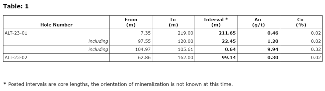 Holes ALT-23-01 and ALT-23-02 tested the south-central portion of an induced polarization chargeability high with coincident copper-in-soil and gold-in-soil anomalies. The drill program is expected to recommence in May, 2024, and will focus on three areas of coincident copper-in-soil, molybdenum-in-soil and gold-in-soil geochemical anomalies that indicate potential centres of porphyry mineralization.
