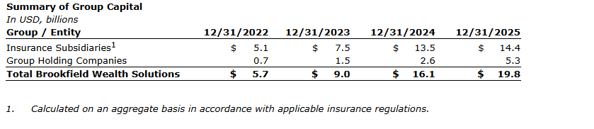 Brookfield Wealth Solutions Ltd. has released its year-end 2025 capital position with nearly $20-billion of group capital across its regulated insurance subsidiaries and holding companies.