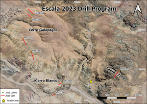 The Company's inaugural drilling was completed on October 24, 2023, and tested both the Cerro Galapagos and Cerro Blancos areas as well the Laura Zone. The Cerro Galapagos target area hosts a large, multi-phased, felsic intrusive complex with extensive alteration and up to 4 phases of sulphide mineralization observed. HRC2303 and HRC2304 tested the Cerro Galapagos area, HRC2305 was completed in the Cerro Blanco area.