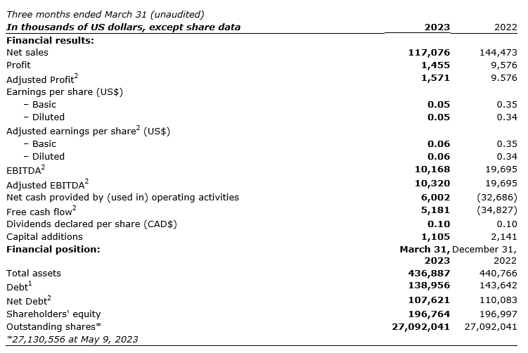 Adjusted EBITDA (earnings before interest, taxes, depreciation and amortization) for Q1 2023 decreased by 47.6 per cent to $10,168, compared with $19,695 in Q1 2022, with the decrease driven primarily by lower volumes at ADG related to HHS nitrile patient examination glove contract deliveries in Q1 2022, in addition to continued raw material price, partially offset by modest reductions in freight across the organization and improved execution at engineered products.