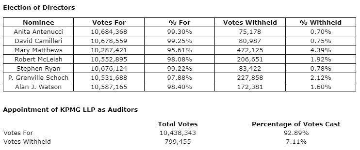 AIRBOSS ANNOUNCES RESULTS OF ANNUAL GENERAL MEETING