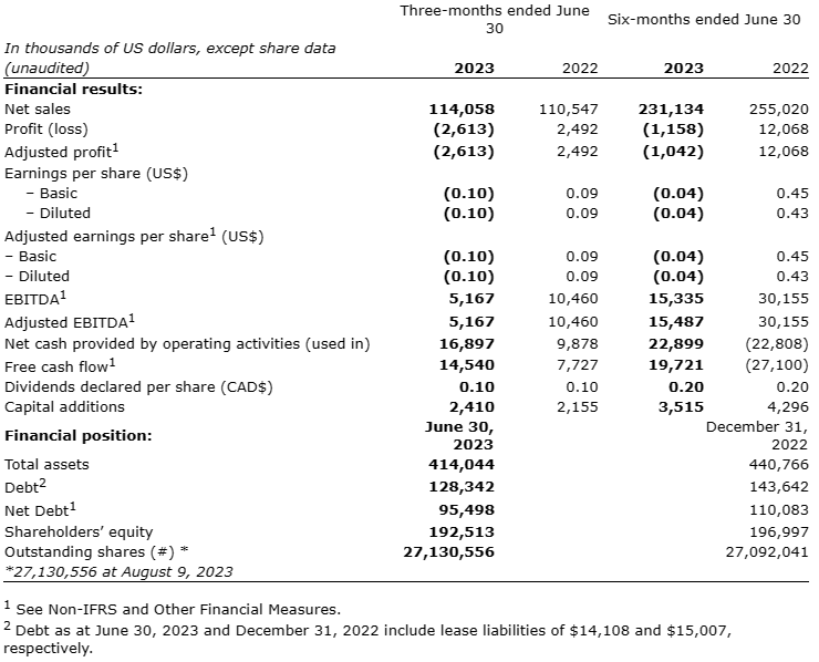 "AirBoss experienced stable consolidated sales levels and volume recovery in certain segments as compared to last year, however an unfavorable product mix and elevated operating expenses had a negative impact on profitability for Q2 2023. From a market demand perspective, some of the improvements we saw toward the latter part of Q1 2023 continued through this quarter, but customer volumes remained below those experienced in 2022, especially within Rubber Solutions and AirBoss Defense Group. Within Rubber Solutions, we were able to successfully offset reduced sales volumes with improved margin contributions resulting from past investments in production automation. Our Engineered Products business segment continued to deliver strong performance, supported by our past investments in automation and elevated demand across several customer categories," stated Chris Bitsakakis, President and Co-CEO of AirBoss. "In addition, solid free cash flow generation of $19.7 million year-to-date in 2023 has allowed us to continue to strategically invest in the business while reducing our net debt levels, which have declined by over $14.6 million since the beginning of 2023."