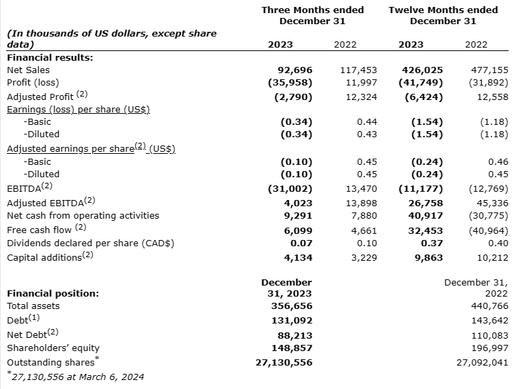 "Our businesses and the markets in which we operate continue to experience significant change, and we believe our shift in strategic focus will help prioritize investments, drive long-term shareholder value, growth and be accretive to the Company," added Gren Schoch, Chairman and Co-CEO. "We have focused on fortifying our balance sheet from cash generated in 2023, and continue to explore implementing further cost reduction initiatives within our business units in 2024. As an organization, we remain committed to our long-term priorities, including growing the core Rubber Solutions segment, refocusing the range of products which Manufactured Products sells, while ensuring alignment with our new strategic direction, and investing in core areas of the business to support long-term sustainable growth."