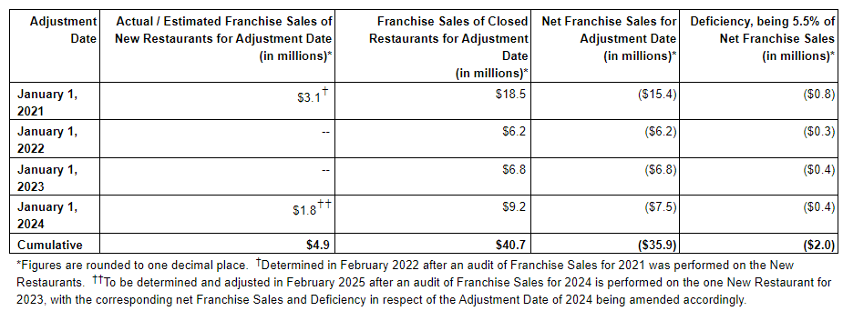 The estimated annual franchise sales in 2024 for the one new restaurant that opened in 2023 is $1.8-million. As described above, BPI is required to deduct from this amount the actual franchise sales received from the six closed restaurants in 2023 during the first 12-month period immediately following their addition to the royalty pool, which is $9.2-million. Accordingly, the resulting estimated annual net franchise sales for 2023 is negative $7.5-million. The net royalty and distribution income in respect of the adjustment date of Jan. 1, 2024, is negative $400,000 (the deficiency, being 5.5 per cent of negative $7.5-million net franchise sales). Since there was a deficiency in respect of each of the Jan. 1, 2021, adjustment date, the Jan. 1, 2022, adjustment date and the Jan. 1, 2023, adjustment date, there is currently a cumulative deficiency of $2-million. A summary of the cumulative deficiency is as shown in the associated table.