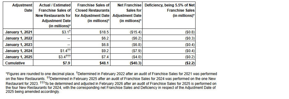 While no adjustments to the royalty pool occurred for the adjustment date of Jan. 1, 2026, due to there being no new restaurants or closed restaurants, a deficiency (being 5.5 per cent of any negative net franchise sales for any given adjustment date) from prior adjustment dates remain outstanding. Since there was a deficiency in respect of each adjustment date from Jan. 1, 2021, to Jan. 1, 2025, there is currently a cumulative deficiency of $2.2-million. A summary of the cumulative deficiency is as shown in the attached table.