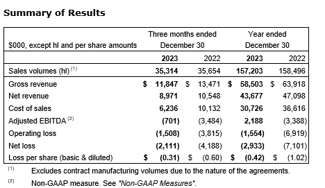 Big Rock Brewery Inc. has released its financial results for the three months and year ended Dec. 30, 2023.