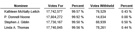 The resolution to appoint the four nominees as directors of the corporation to serve until the next annual meeting of shareholders of the corporation, or until their successors are elected or appointed, was passed by way of ballot, and each of the directors received the following votes for election.