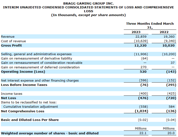 "We extended our momentum in the first quarter with the strong growth reflecting the continued success of our initiatives to diversify the business towards being a content-driven iGaming solutions provider in a growing number of North American and European markets," said Yaniv Sherman, Chief Executive Officer for Bragg. "We generated record first quarter revenue of EUR euros22.9 million (USD $25.2 million), gross profit of EUR euros12.2 million (USD $13.4 million), and Adjusted EBITDA of EUR euros3.9 million (USD $4.3 million), marking gains of 18%, 22% and 28%, respectively, over 1Q22 levels. These results include the benefit of growing contributions from higher margin proprietary and exclusive third-party games, and platform solutions which helped drive a 170-basis point year-over-year improvement in our gross profit margin to 53.5%.