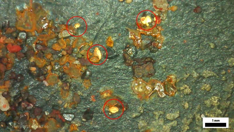 Figure 2. Visible Gold occurrences in panned concentrate from the newly discovered “Mocururu” samples collected within tenement 886.196/2017 (location is shown in the figure 1).