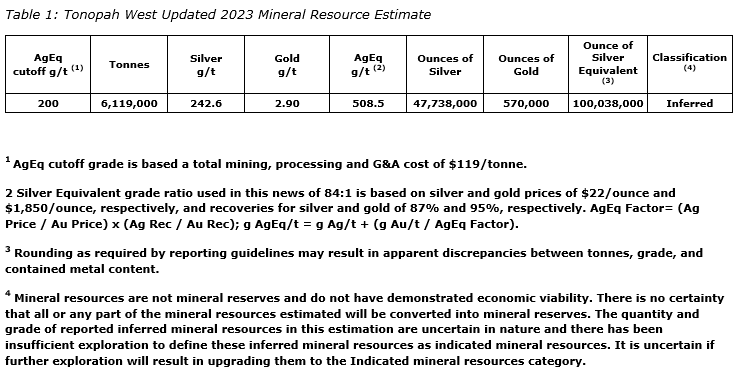 - The updated MRE contains a total of 570,000 ounces of gold and 47.74 million oz of silver or 100.04 Moz of silver equivalent, which is a 135-per-cent increase over the maiden resource estimate for Tonopah West included in the technical report dated effective April 28, 2022.