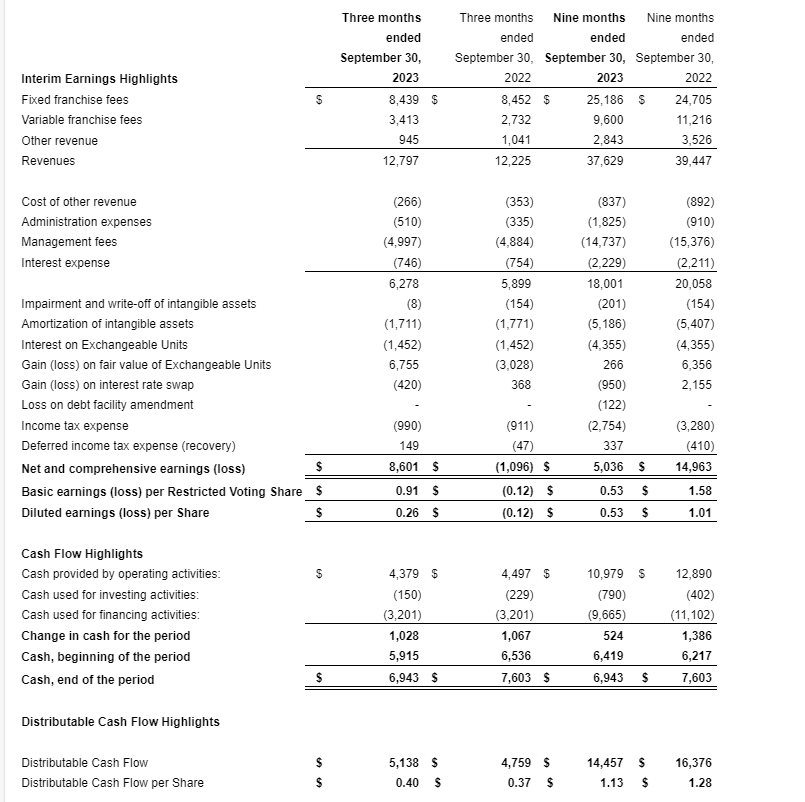 During the quarter, the company generated net earnings of $8.6-million or 91 cents per fully diluted restricted voting share, compared with a net loss of $1.1-million or 12 cents per share in the same quarter in 2022. Net earnings increased primarily due to a gain of $6.8-million on the fair value of the exchangeable units compared with a loss of $3-million in the third quarter last year. The fair valuation adjustment on the exchangeable units is directly related to changes in the market price of the company's shares.