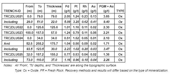 In the case of trench TRC23LU022 (Figure 2), mineralization is also still open at each end of the trench, signalling the potential for further improvement when the trench is extended. Furthermore, both ends of the trench finished in the highest-grade portions of the trench: 0m (Start of Trench) to 9m grading 5.62g/t PGM+Au and 117m to 125.6m (End of Trench) grading 4.66 g/t PGM+Au.
