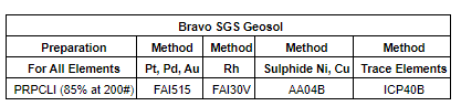 Samples follow a chain of custody between collection, processing, and delivery to the SGS laboratory in Parauapebas, state of Para, Brazil. The drill core is delivered to the core shack at Bravo's Luanga site facilities and processed by geologists who insert certified reference materials, blanks, and duplicates into the sampling sequence. Drill core is half cut and placed in secured polyurethane bags, then in security-sealed sacks before being delivered directly from the Luanga site facilities to the Parauapebas SGS laboratory by Bravo staff. Additional information about the methodology can be found on the SGS Geosol website (SGS) in their analytical guides. Information regarding preparation and analysis of historic drill core is also presented in the table below, where the information is known.