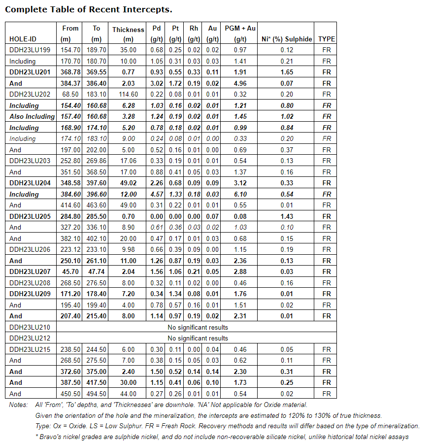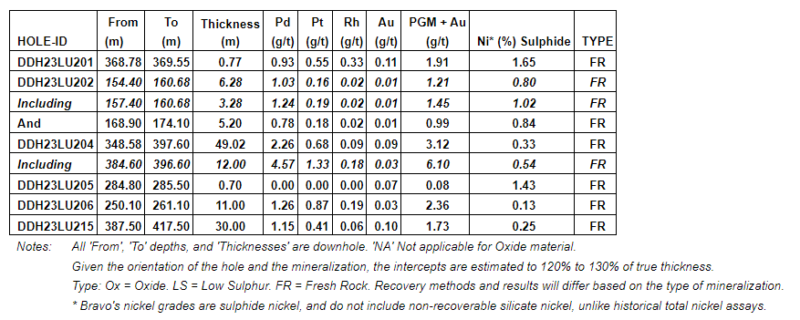 BRAVO EXTENDS PGM+AU+NI MINERALIZATION TO DEPTH & INTERCEPTS MORE MAGMATIC NICKEL SULPHIDES
