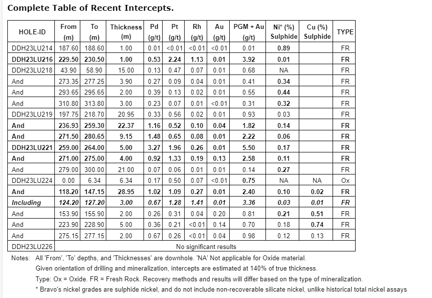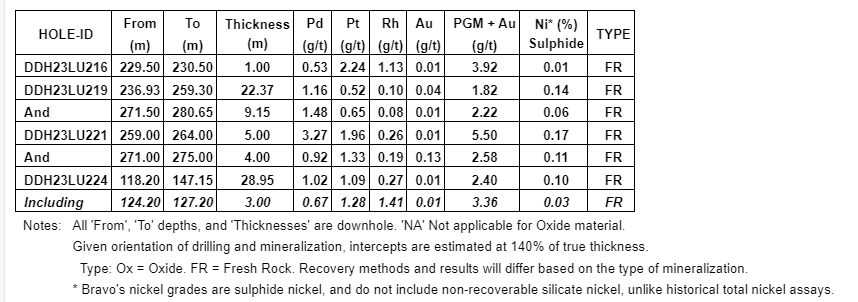 BRAVO INTERSECTS SHALLOW, WIDER AND HIGHER-GRADE PGM+AU+NI MINERALIZATION IN THE NORTH SECTOR AT LUANGA