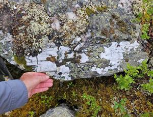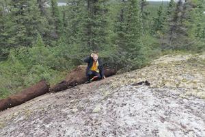 Figure 4: Mr. Rémi Charbonneau, Ph.D., P. Geo., of Inlandsis Consultants, discoverer of the Mirage lithium pegmatite field, examining a spodumene-rich outcrop.
