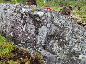 - The spodumene boulder dispersion train leads directly to several spodumene-bearing pegmatite outcrops that are spread over an additional 2.7 km along the same NE-SW trend, suggesting the geological strike is sub-parallel to glacial dispersion in this area. In total, the trend of boulders and outcrops covers over 5.5 kilometres of strike and remains open.