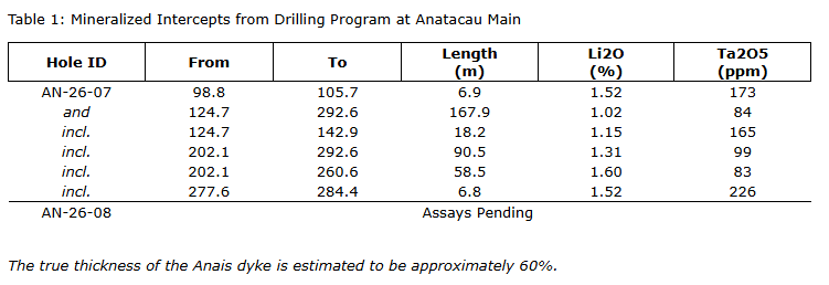 Brunswick Exploration Inc. has released initial results from the 2026 winter drilling campaign at the Anatacau Main project, located in the Eeyou Istchee-James Bay region of Quebec. This campaign was designed to confirm the downdip and lateral extensions of the Anais Main dike at depth and extend the pegmatite trend to the east.