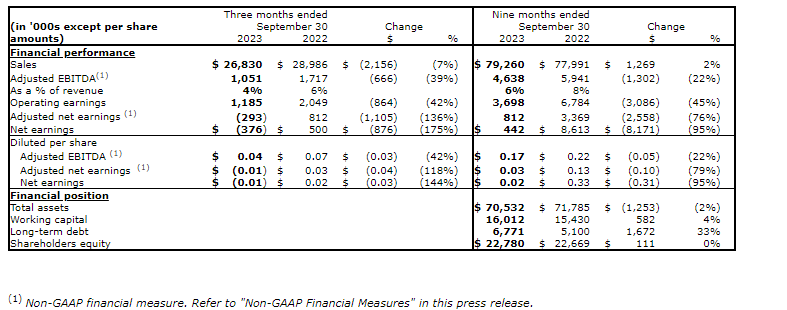 Operating earnings for the three months ended Sept. 30, 2023, was $1.2-million compared with $2.0-million during the same period last year. Adjusted EBITDA was $1.1-million for Q3 2023 compared with $1.7-million for Q3 2022. Adjusted EBITDA as a percentage of sales was 4 per cent for the quarter, which is a decrease over the 6 per cent in Q3 2022. The decrease is primarily attributable to increased financing costs and employee overheads.
