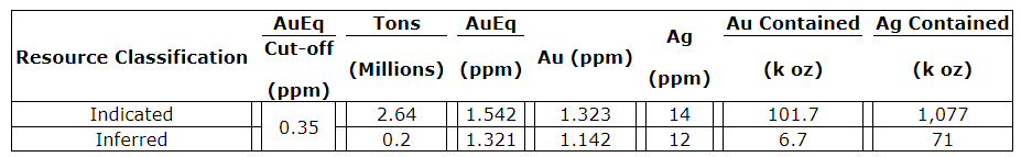 The historical resources were classified according to CIM (Canadian Institute of Mining, Metallurgy and Petroleum) guidelines as indicated and inferred mineral resources. The indicated mineral resources was defined by a wireframe solid constructed about the core of the mineralization where most drilling is spaced 25 ft to 50 ft apart. All blocks located outside of this solid were classified as inferred mineral resources.