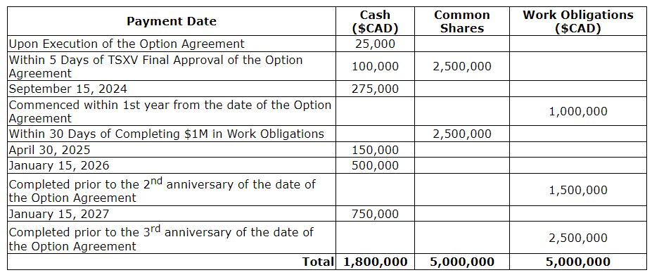 The work obligations, and cash and common share payments that are payable by Bessor to K2 under the option agreement are set out in the associated table.