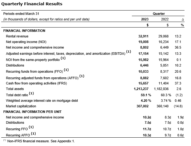 Net operating income (NOI): stood at $19.0-million for the current quarter, which represents an increase of 17.1 per cent compared with the same quarter of 2022; same-property NOI was stable for the first quarter of 2023 compared with the same period in 2022;