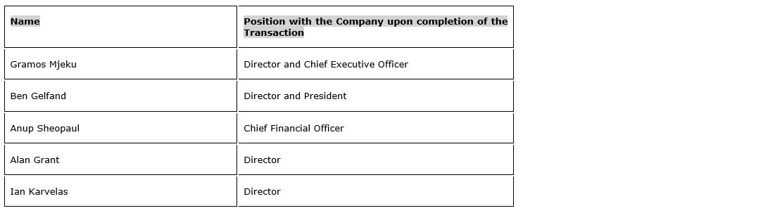 The board of directors of the company presently is made up of three members, being Ben Gelfand, Alan Grant and Ian Karvelas. Pursuant to the agreement, the board shall be reconstituted within three months of the closing of the transaction to include the appointment of Gramos Mjeku. The company also intends to appoint Mr. Mjeku as the chief executive officer of the resulting issuer. The names of the intended directors and officers of the resulting issuer following completion of the transaction and their respective positions are as set forth in the attached table.