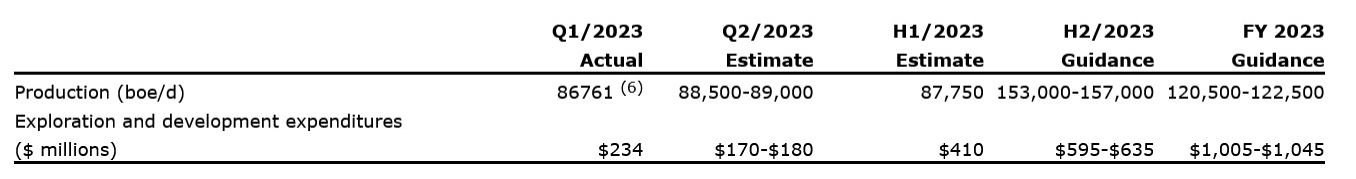 The company continues to execute on its base business as planned. Its average production for the second quarter of 2023 is estimated at 88,500 to 89,000 boe/d, which includes production from Ranger for the 11 days following closing of the merger. Production in Q2 2023 was reduced by approximately 4,500 boe/d due to the temporary curtailment of production resulting from the wildfires in Alberta.