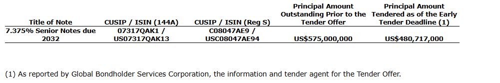 All 2032 notes that have been validly tendered and not validly withdrawn at or before the early tender date will be purchased, retired and cancelled by Baytex on the early settlement date.