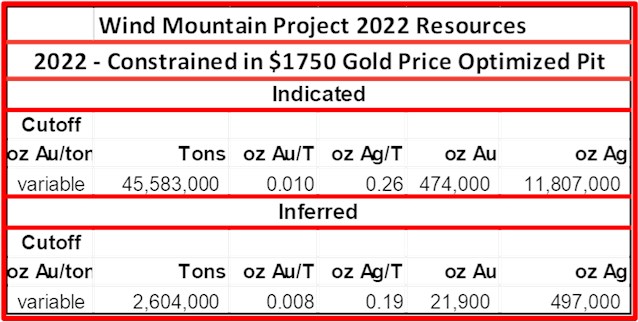 After verifying and slightly modifying the Wind Mountain 2012 global resource based on subsequent drilling, which was confirmed to within less than 1 per cent, a total pit-constrained resource was calculated by Respec utilizing the approximate three-year trailing average, base-case price of $1,750 (U.S.) per ounce of gold and $21 (U.S.) per ounce of silver. Results are tabulated below.