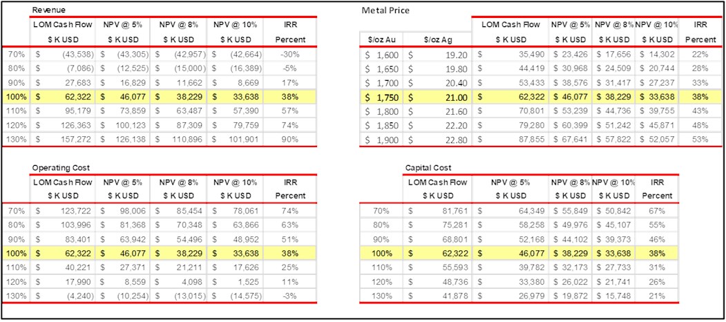 Sensitivity studies by Respec are presented in the table below. Respec notes that additional studies such as further metallurgical studies to evaluate crushing higher-grade portions of the deposit and grid drilling to delineate economic portions of the previously mined waste rock, which are given no value in the current model, could further enhance the economics. For example, Respec notes that 1.1 million tons of historic mine waste is currently classified as waste and must be removed during phase I mining; however, results of limited drilling, surface sampling and trenching by Bravada suggest the material contains potentially recoverable gold. Respec and Woods recommend that the material be placed in a stockpile for additional study or utilized as overliner on the leach pads; the material potentially would be added to the currently designed phase I pad to further reduce the strip ratio and increase positive economics.